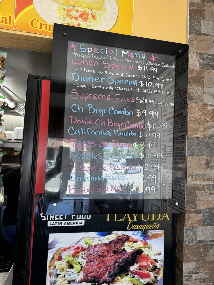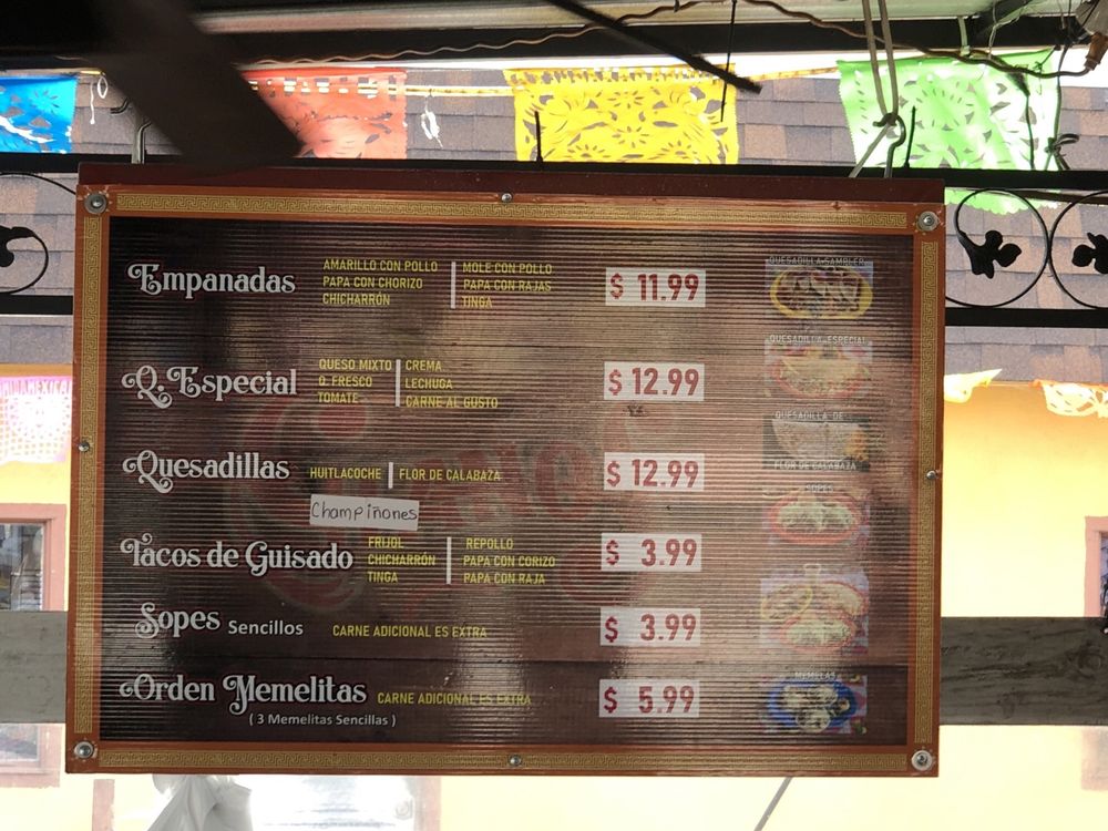 Big corn tortilla with lard, black bean paste, Oaxacan string cheese, cabbage, tomatoes, avocados and choice of 2 meats cesina, tazajo or chorizo.