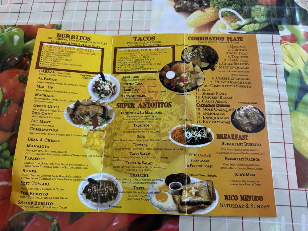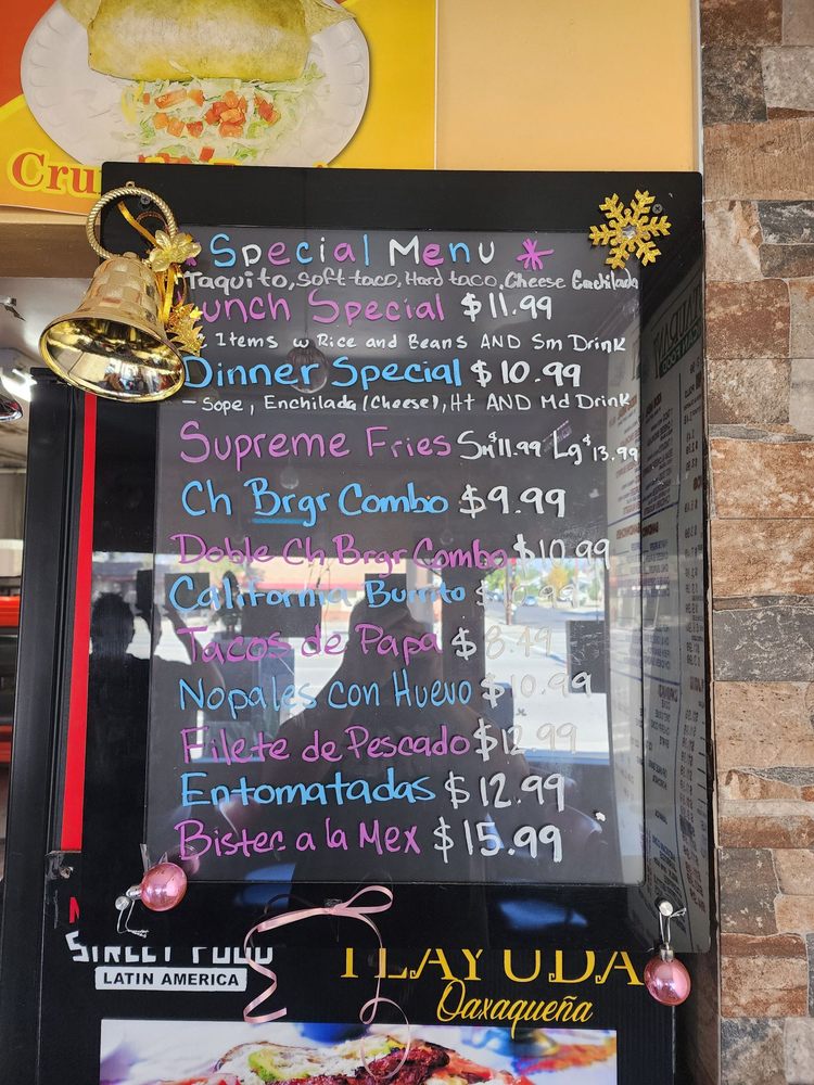 Ground beef, rice, beans, guacamole, potatoes, topped with green or red sauce.