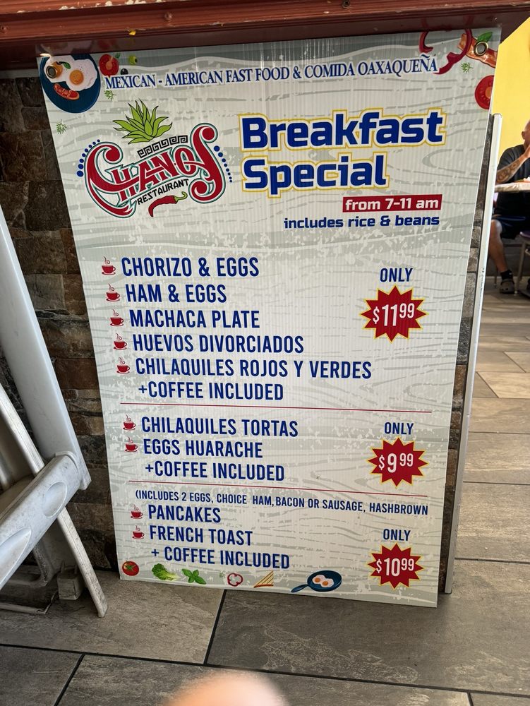 Crispy tortilla chips topped with beans, cheese, scramble eggs and choice of meat.